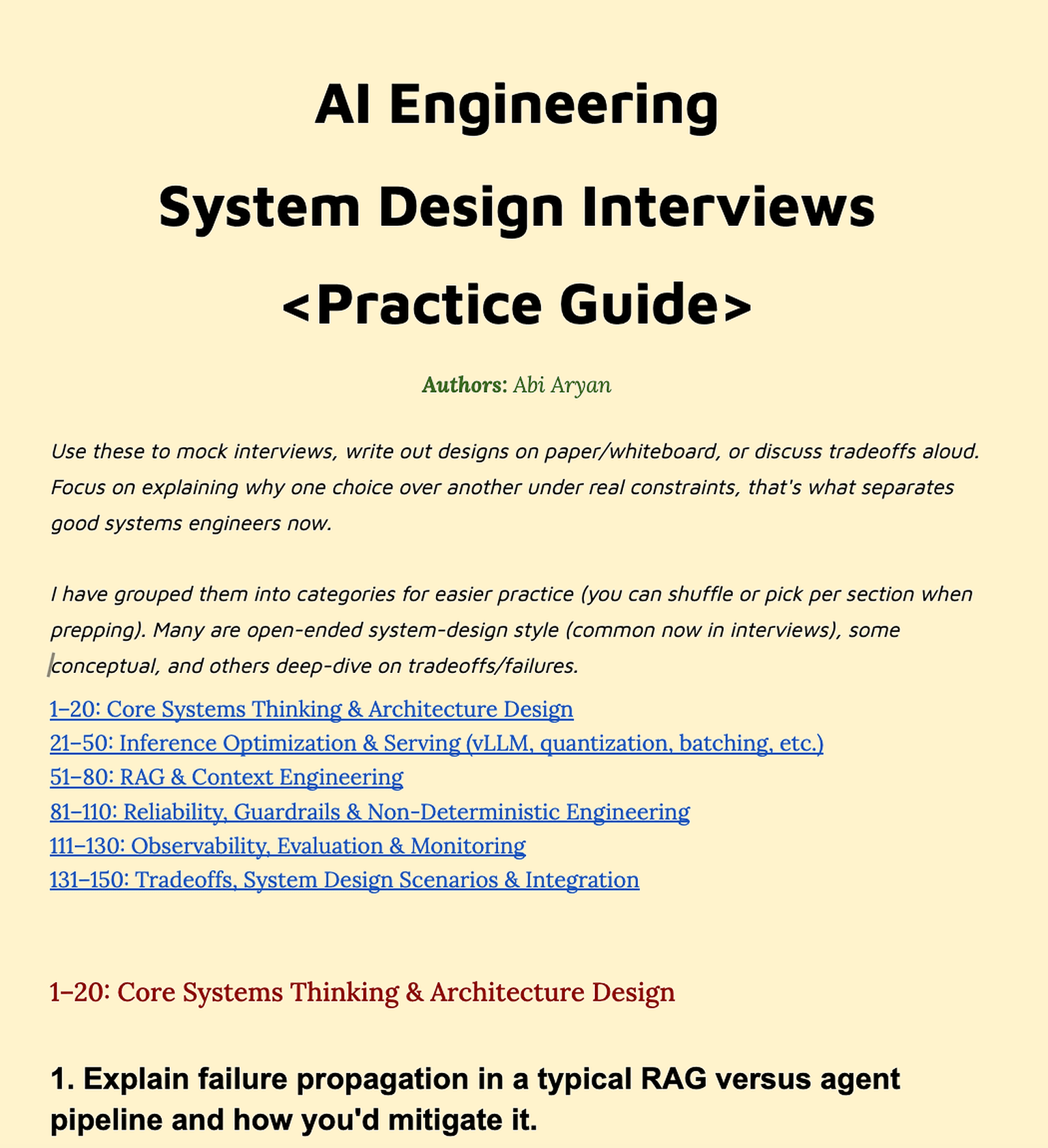 It covers 150 practice questions covering interview questions for 1. Systems Architecture Design 2. Inference Optimization & Serving 3. RAG & Context Engineering 4. Reliability and Guardrails 5. Observability, Evaluation & Monitoring, and finally 6. Tradeoffs, Scenarios & Integrations