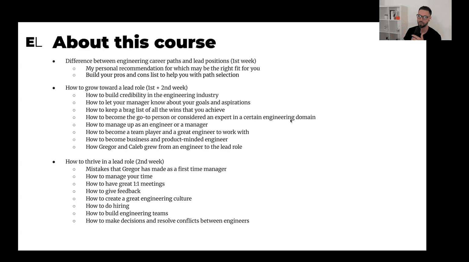 We will define the difference between engineering lead roles and different career paths (1st week)