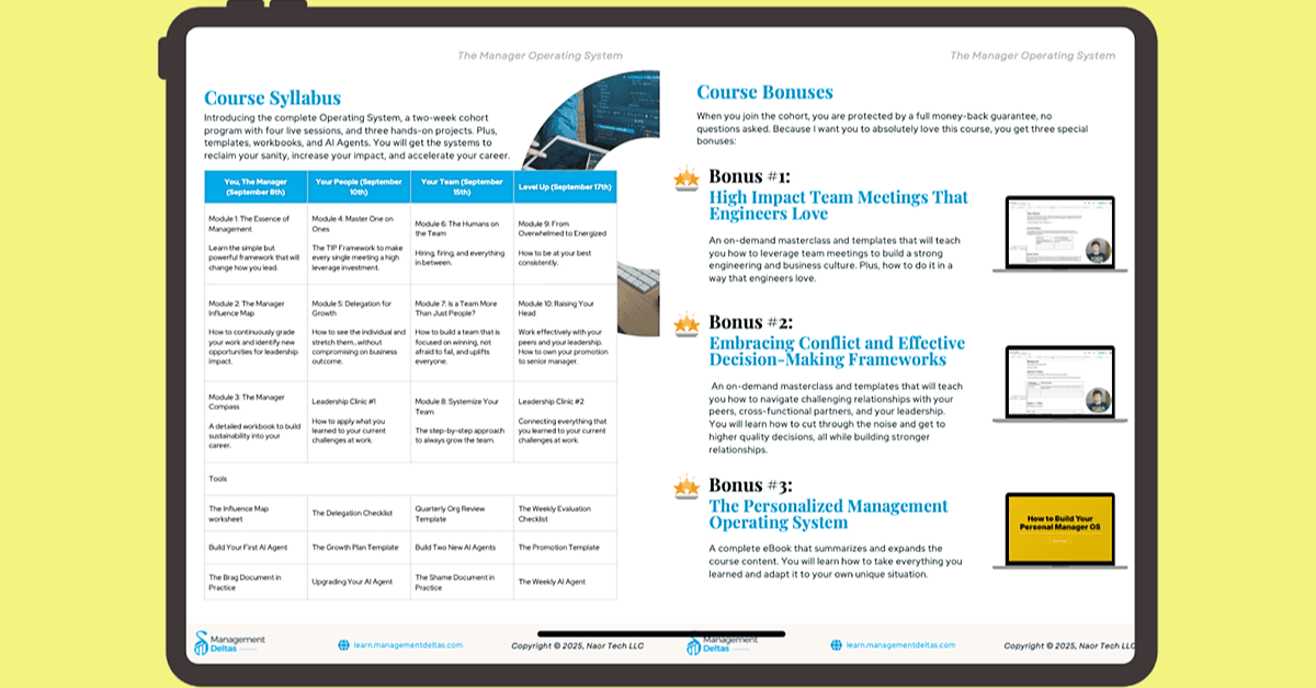 The bridge between these two realities? A proven management Operating System used by engineering managers at Meta, Amazon, Uber, and fast-growing startups.