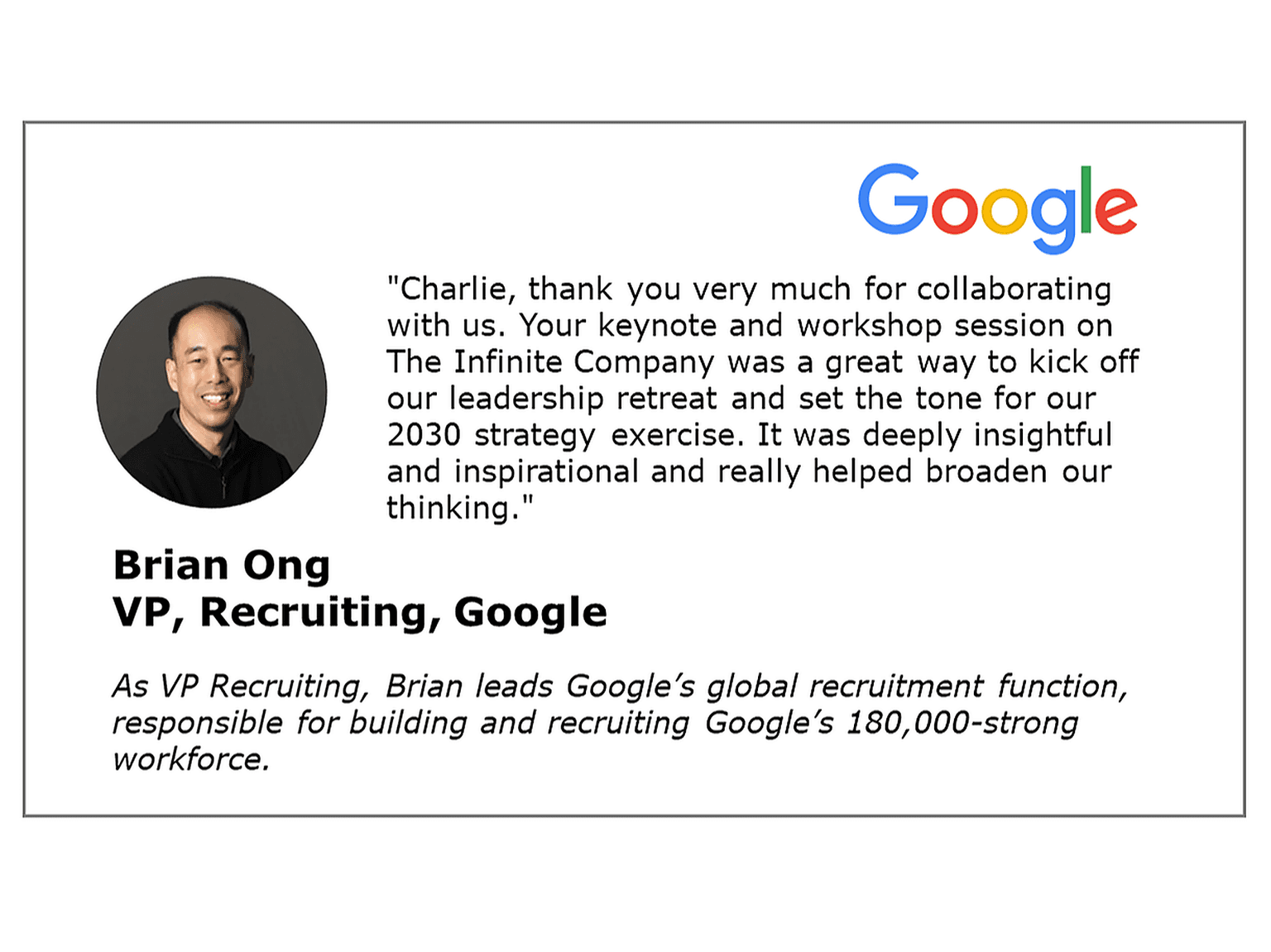 Charlie's thought-provoking sessions inspire and equip audiences to lead their companies with confidence and clarity, amidst constant disruption and change.